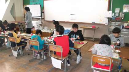 先週末より3年2組との交流給食を始めています。自己紹介をしたり,外をちらつく雪を見ながらお話して交流しました。