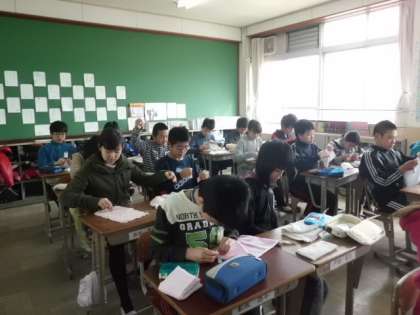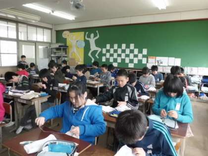 家庭科の授業では、雑巾作りをしています。一針一針丁寧に、心を込めて縫っています。
