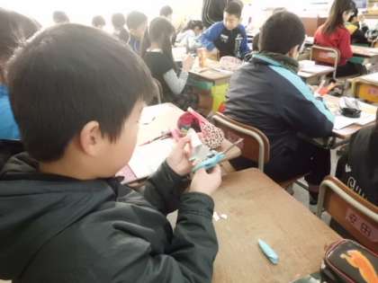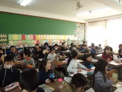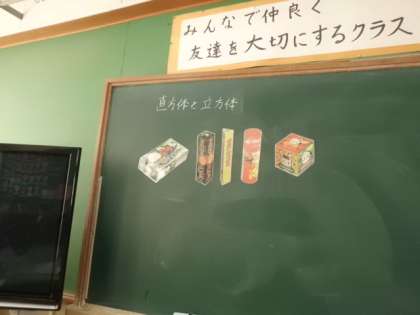 算数の時間に、「直方体と立方体」がどうなっているかを、持ってきた箱を分解して調べました。切った物は、同じ形ずつ机の上に並べていました。