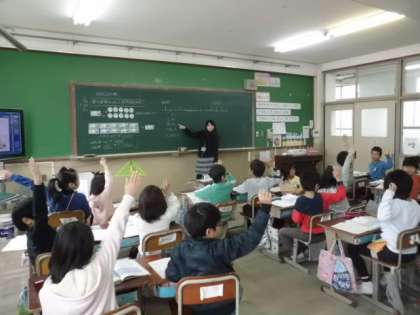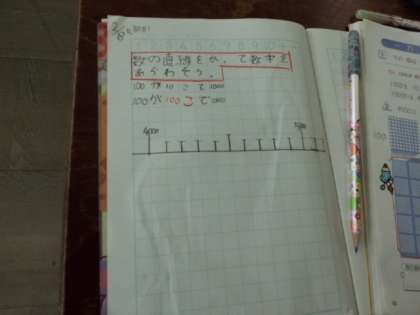「10000までの数」を、数直線に表す学習をしました。黒板に書いてある数直線の4000から5000までの間に、目盛りはいくつあるかをみんなで考えました。