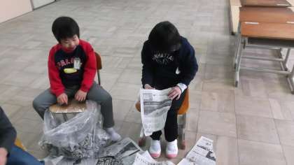 低学年児童も作品展に向けて制作しています。今日は袋の中に新聞紙を詰めました。新聞紙を丸めるのも手先を動かす学習です。こつこつ丁寧に作業しました。
