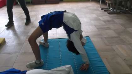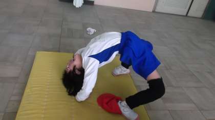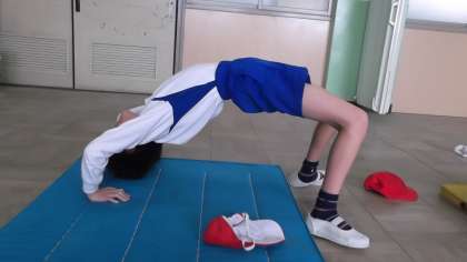 体育の時間にマット運動をしました。体ならしの運動をしてから「ブリッジ」に挑戦しました。しっかり手をついて,マットを見て頑張りました。