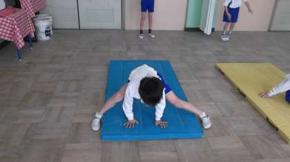 体育の時間には,自分の今できる技を練習しています。連続で回れるように頑張っているお友達もいます。マット運動楽しいな!