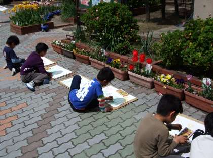 とても良いお天気だったので,教室を飛び出して外でお花の絵を描きました。