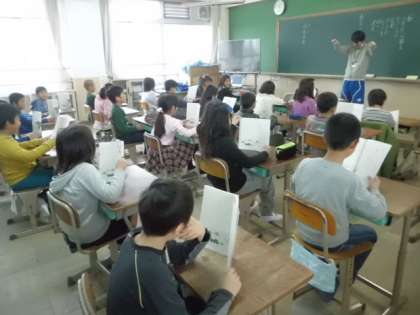 新しい教科書を開いて楽しそうに大きな声で読んでいました。担任の先生も負けずに大きな声で読んでいました。これからの学習が楽しみです。