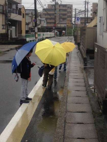 雨の日の下校は子どもたちにとっては楽しいものです。しかし,安全第一。気をつけて下校しましょう。こんな雨の日も地域の各種団体の皆様が子どもたちを見守っていただいています。ガード下や交差点などポイントごとに多くの方が立っていただいています。雨の中を本当にありがとうございます。