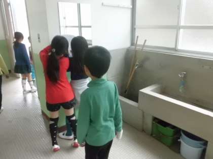 4年生が地図を片手に校舎をうろうろしていました。なにをしているのだろ?どうやら学校にある手洗い場の数を調べていたようです。予想の数より多い,少ない?中にはピッタリ合っていた児童もいるようでした。