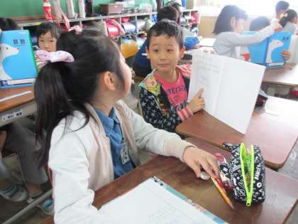 算数の学習では,自分の考えを二人組で交流し,そして全体の場で確かめあいます。