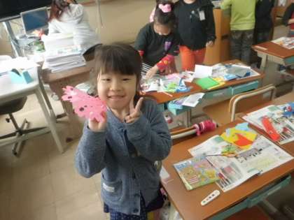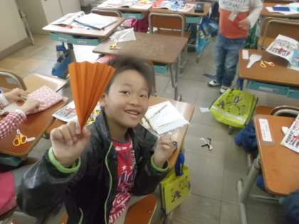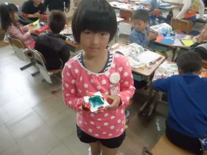 はさみを上手につかって,折り紙を切っていきます。みんなきれいなかざりをつくることができたようです。自慢げに見せに来てくれました。
