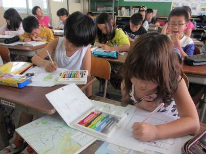 社会の学習では,校区内で自分のおきにいりの場所をカードに書いていきました。毎日遊んでいる公園や,おうちの人と買い物に行くスーパーなど,学校の周りにはいろいろな場所があることが分かりました。