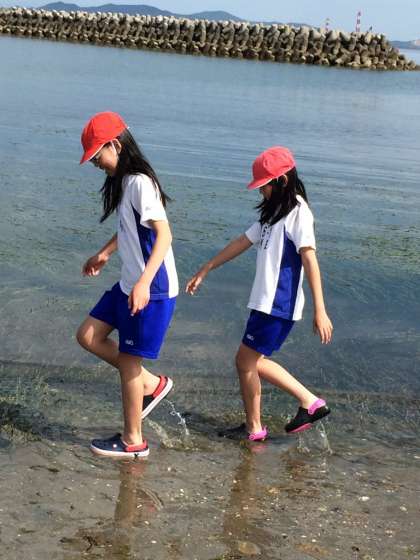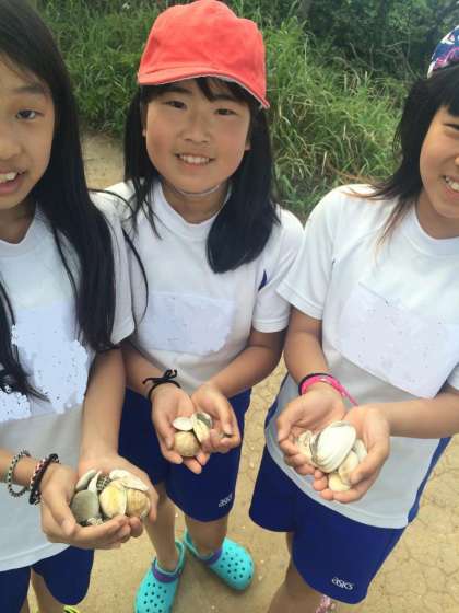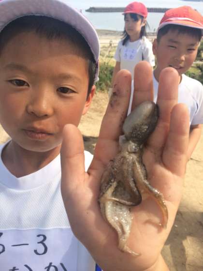砂浜に移動し,浜遊びをしています。貝やイカをゲットしたようです。