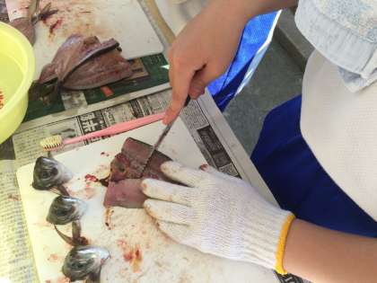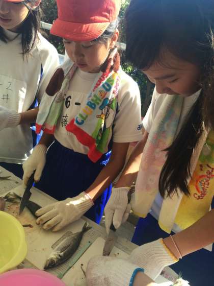 スタートから「ぎゃ〜。」や「ぎょえ〜。」という悲鳴があがっています。中には上手に包丁を使って冷静にさばいている児童もいます。落ち着いて丁寧に仕上げましょう。