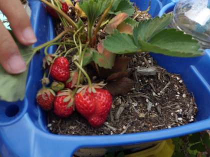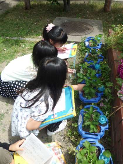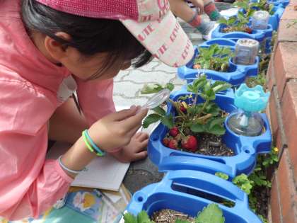 2年生の時に植えたイチゴがついに実をつけ始めました。少し小ぶりですが,赤いかわいい実がついています。まだ色がついていない実も,じきに真っ赤になることでしょう。