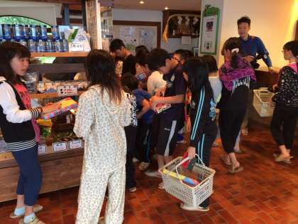 旅館の売店にレッツゴー。悩みながらお土産を選んでいます。あげる人のことを考えているのかな?