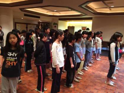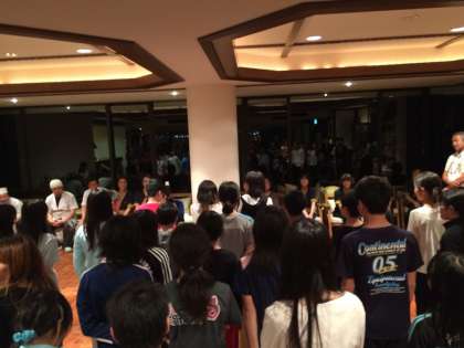 修学旅行1日目最後のイベントは,日間賀島観光ホテルで働く皆さんへ感謝の気持ちを伝えることです。最高の景色,最高の食事,最高のおもてなし。本当にありがとうございます。歌う曲は「花は咲く」です。聞いてください。