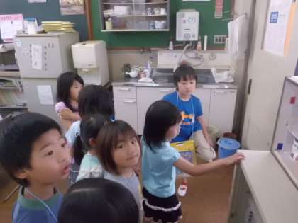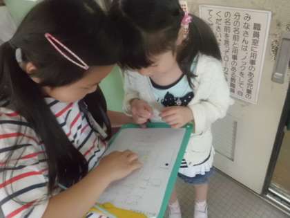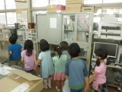2年生が1年生にていねいにやさしく教えています。どのグループもすべての教室や特別教室をチェックできたみたいです。1年生は2年生むかって「2年生のみんなありがとう」としっかり言うことができました。