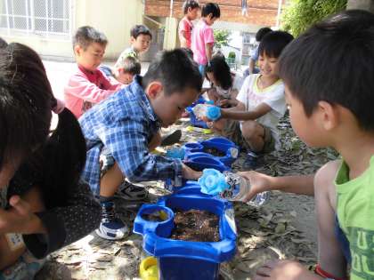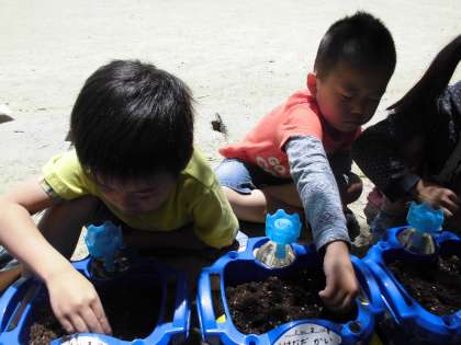 2年生からもらったあさがおの種を植えました。「大きくなあれ。大きくなあれ。」と声をかけながら,水をあげました。しっかり世話をしてきれいな花を咲かせてくださいね。