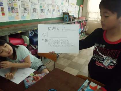 わり算を使った問題についての学習をしました。式がわり算になる問題を自分たちで考え,友だちと交流しました。