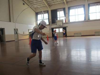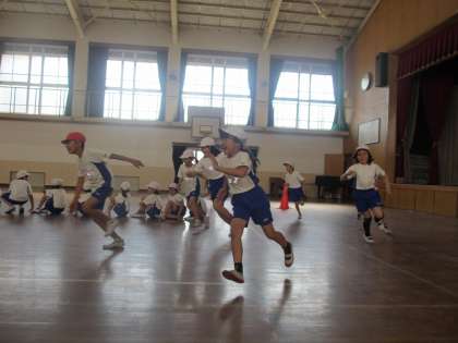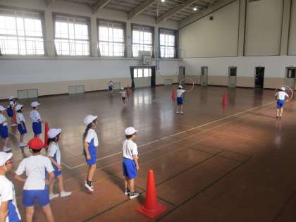 1組の今日の体ほぐしは『フラフープリレー』に『いけこい』というおにごっこでした。フラフープを片手で回しながら走るのには,かなり苦労をしていましたが,なんとか全チームゴールにたどりつくことができました。