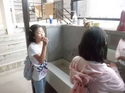 みんなぐっすり寝ることができたようで,朝一から歯を磨いて,すぐにミーティングしているグループもあります。