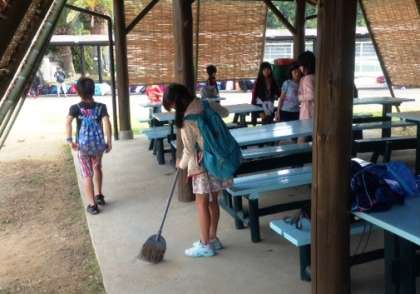 食事の時に何度もお世話になった「あずま屋」をみんなできれいにしています。