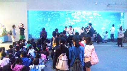 鳥羽水族館に到着しました。大型水槽ではたくさんの魚たちが川岡東小学校4年生を出迎えてくれました。