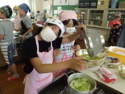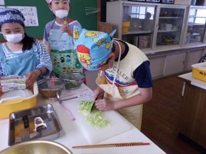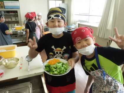 今日は「コンビネーションサラダ」を作りました。色とりどりの野菜をつかったサラダです。自分達でドレッシングも作って本格派。さぁ〜お味はどうですか?
