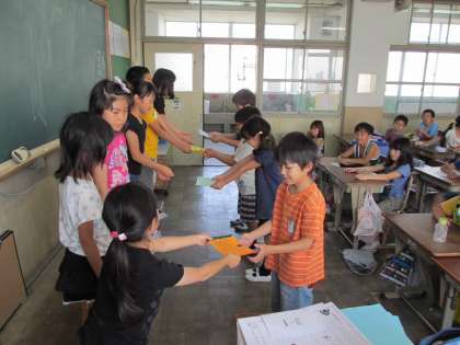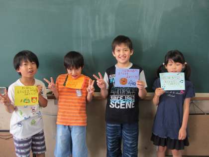 みんなから『おめでとう』の拍手をしてもらって,少し照れている4人でした。