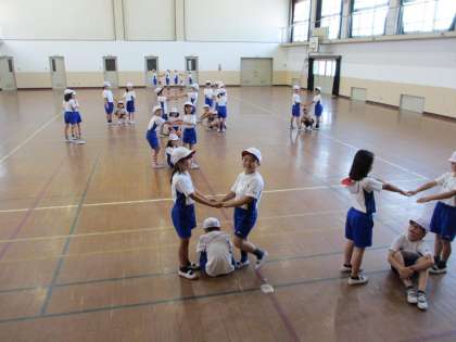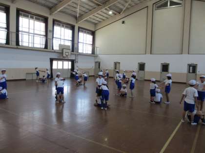 かけ声に合わせて,チームづくりを楽しみました。さて,楽しかった体ほぐしもあと1時間で終了。みんな,少しさみしそうにしていました。