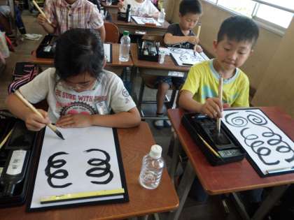 横画の書き方や縦画の書き方を練習したり,うずまきを書いてはらいを練習したりしました。自分の名前も練習し,はじめての習字学習は無事終了。みんなの顔は,やり遂げた充実感でいっぱいでした。