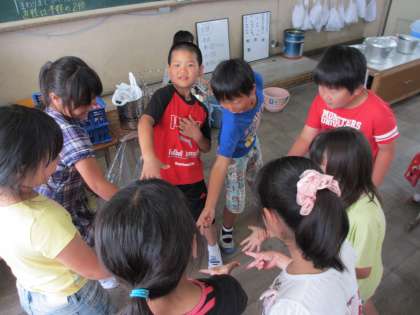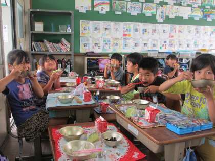 今日の給食は,ごはん,牛乳,小松菜とひじきのいためもの,あんかけご飯の具,そしてメロンでした。あんかけご飯の具をかけて食べるご飯のおいしさに,子ども達の顔はにっこり笑顔。そして子ども達をさらに笑顔にさせる瞬間が・・・。