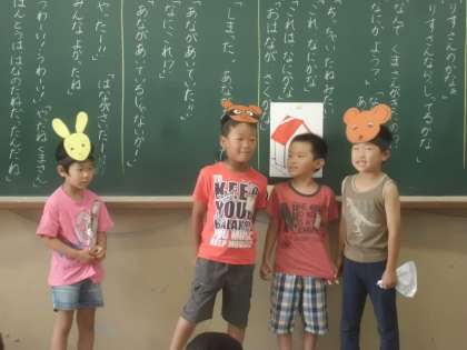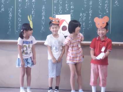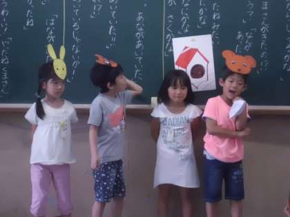 国語の学習で,「はなのみち」を劇にした発表会をしました。グループで相談し役を決め,子ども達で台詞や動きを考えました。場面の雰囲気や楽しさを伝えようと,みんな一生懸命練習に取り組み,本番の発表会では緊張しつつもとても上手に役を演じていました。とても可愛らしかったです。