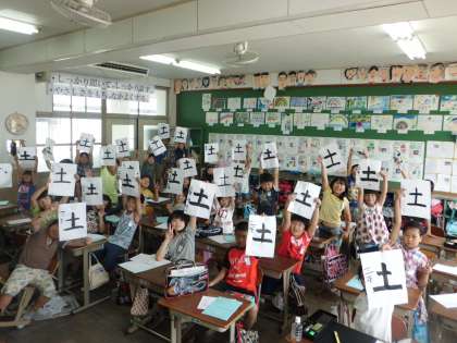 今日は『土』という漢字を書きました。よい持ち方で始筆・送筆・終筆に気を付けて書くことをめあてにしました。すでに3回目の習字の学習ですので,子ども達も慣れてきたようです。