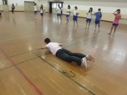 今日は朝から雨が降っていたので,体育館で体づくり運動をしました。腕立て伏せや腹筋,背筋などの筋力トレーニングを数セットくりかえしました。体幹を鍛えることで,疲れてきても正しいフォームで走ることができます。