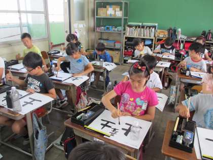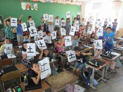 1組の習字も『土』です。「縦画」の筆使いに気を付けて,字形を整えて書くことができました。たった三画。されど三画。バランスをとるのが難しい字でした。みんな,集中して学習に取り組んでいました。