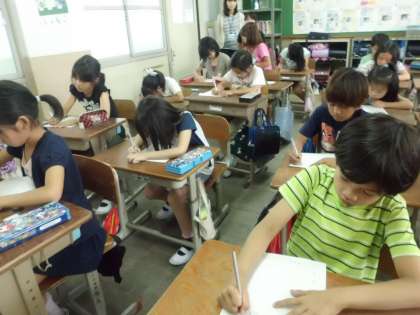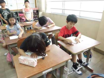 音楽の軽快なリズムに心うきうきの3年生。音楽が止まると近くの席に座り,その友だちの『ええとこ』を書いていきます。