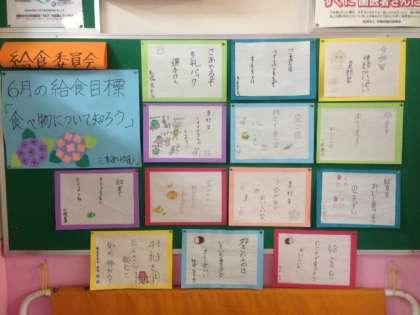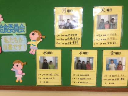 給食当番の子どもたちは給食室に入る前にしっかりと手を消毒をしています。また給食委員会の子どもたちは当番活動以外にも給食目標を掲示物で上手にアピールしたりして熱心に活動しています。