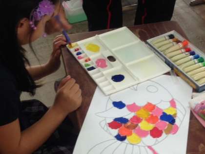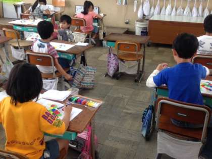 絵の具のパレットへの出し方や筆の使い方など少しずつ学習を進めています。個性的で美しい魚が出来上がりそうです。