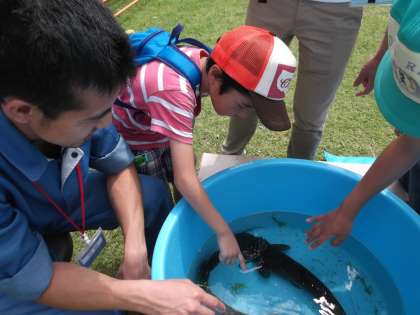 屋外では、ザリガニ、ミミズ、ナマズを触れる場所がありました。