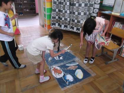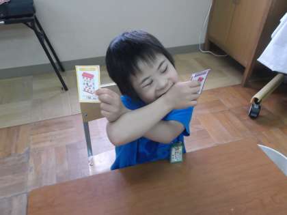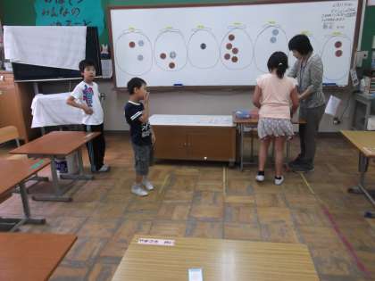お金のコインの貼ったサイコロを振って出た目の金額を自分のお財布に貼りつける。