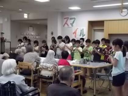 最後には2時間お世話になったお礼にリコーダー曲「おおシャンゼリゼ」をプレゼントしました。利用者さんたちから大きな拍手をもらい,みんないい笑顔でした。