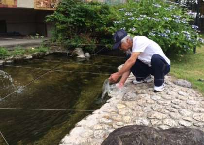 校区にお住いの佐々木さんに錦鯉を寄贈していただきました。池に放していただくと早速うれしそうに泳ぎまわっていました。今までにいた鯉とも仲良く一緒に餌を食べています。大事に大きく育てたいと思います。ありがとうございました。