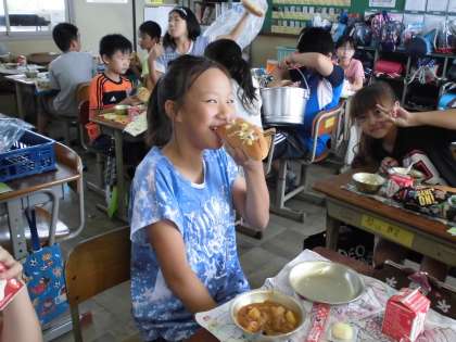 プールのあとはいつも以上にお腹が減るものです。今日はパンに具をはさんで食べるサンドイッチ。高学年用の大きいパンもなんのその。大きいお口をあけて「バクッバク!!!」お腹が減りすぎてもう止まりません!「おかわり」の声が飛び交う5年生です。その食欲に星☆5つ!!