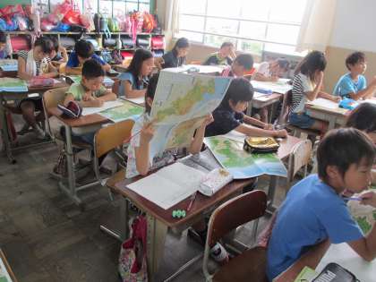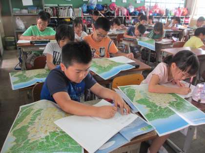 京都市の絵地図を使って行ったことのある場所を探しました。京都水族館,金閣寺,銀閣寺,清水寺など行ったことのある場所を確認しました。