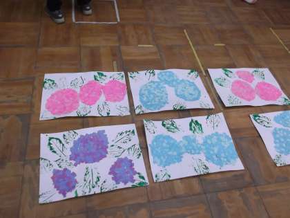 校庭に植わっているあじさいの葉っぱを数枚頂いて本物をスタンプしました。
