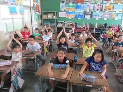 さて,教室に帰った子どもたちはというと,もちろんパントマイムの練習。エスカレーターや首だけ動かす練習など,楽しんでいました。川岡東小学校でパントマイムが流行しそうな気配です。