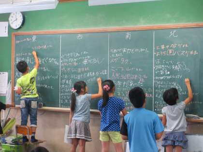 京都タワーから何が見えたのか,東西南北の4チームに分かれて黒板に書いていきました。