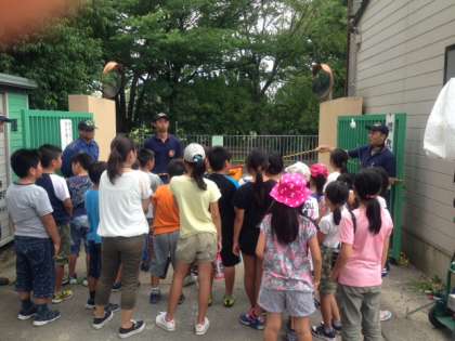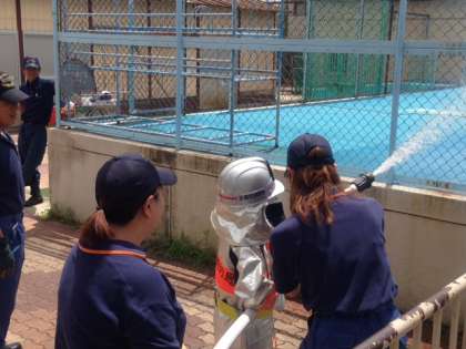 その後,3グループに分かれて,放水体験,消防車・消防団器具庫の見学をさせていただきました。貴重な体験させていただき,消防団・消防署の皆さん,本当にありがとうございました。