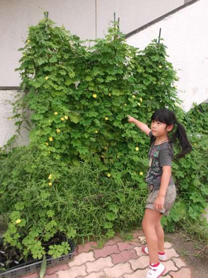 学校のお庭にもぶら下がってるゴーヤを探しにいきました。