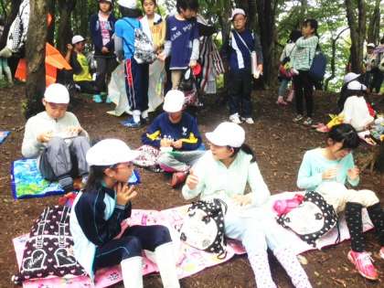 ついに登り切ってお昼ご飯を食べています。みんなこんなにおいしく感じるおにぎりは,なかなかないのでは・・・!?
